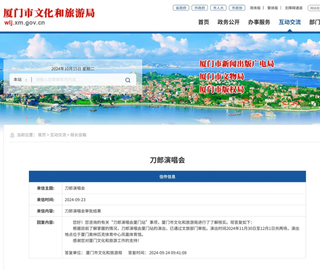 据厦门市文化和旅游局消息,刀郎厦门演唱会已通过文旅部门审批,演出时间为2024年11月30日至12月1日共两场。