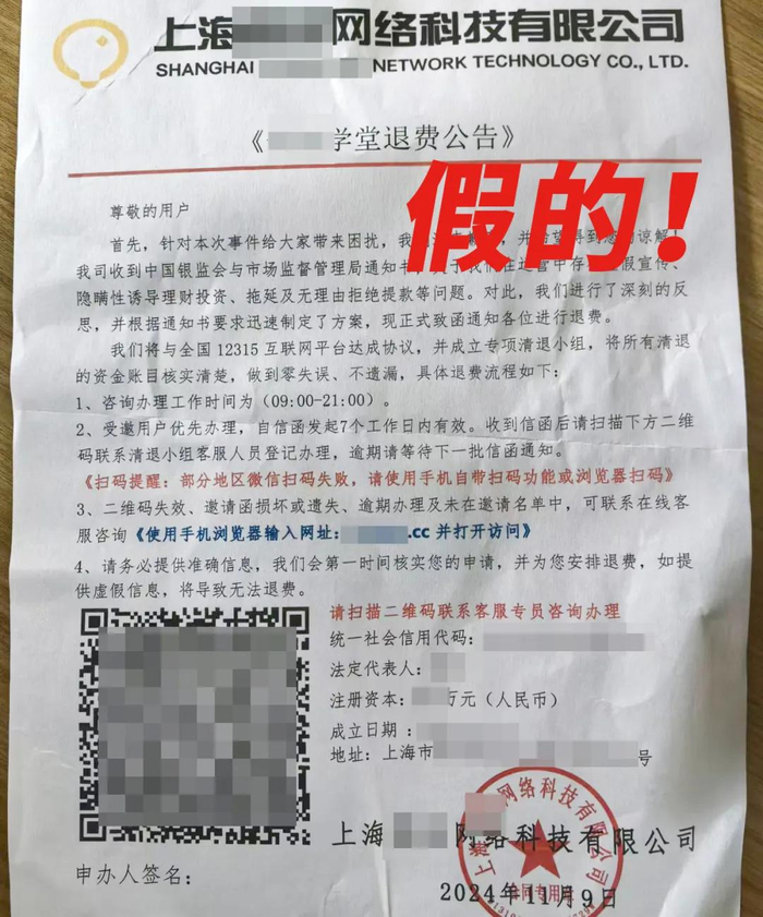 近日,市民朱先生收到一个快递包裹,包裹内有一张落款为某教育机构的退费公告,并附有一个二维码。朱先生想到之前确实在网上办理过相关教育培训,便信以为真,扫码添加了“退款客服”的联系方式。