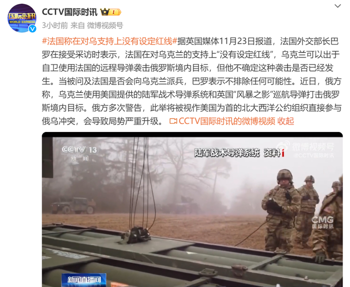 据英国媒体11月23日报道,法国外交部长巴罗在接受采访时表示,法国在对乌克兰的支持上“没有设定红线”,乌克兰可以出于自卫使用法国的远程导弹袭击俄罗斯境内目标,但他不确定这种袭击是否已经发生。当被问及法国是否会向乌克兰派兵,巴罗表示不排除任何可能性。