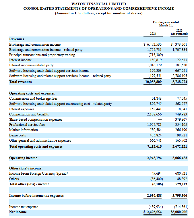 招股书显示,在过去的2023财年和2024财年(财政年度结算日期为每年3月31日),华通证券国际的收入分别为573.88万、1005.58万美元,相应的净利润分别为308.07万、249.66万美元。