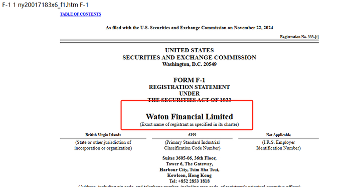 2024年11月22日,来自香港的Waton Financial Limited(以下简称“华通证券国际”)在美国证券交易委员会(SEC)公开披露招股书,拟在美国纳斯达克IPO上市,股票代码为WTF。其于2023年12月22日在SEC秘密递表。