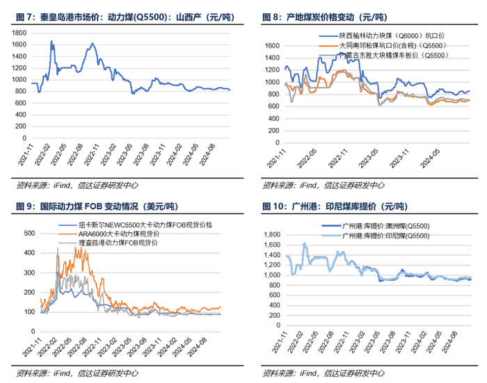 我们认为,当前正处在煤炭经济新一轮周期上行的初期,基本面、政策面共振,现阶段逢低配置煤炭板块正当时。本周基本面变化:供给方面,本周样本动力煤矿井产能利用率为98.9%(+0.8个百分点),样本炼焦煤矿井产能利用率为90.93%(+1.15个百分点)。需求方面,内陆17省日耗周环比上升30.00万吨/日(+8.46%),沿海8省日耗周环比下降0.20万吨/日(-0.1%)。非电需求方面,化工耗煤周环比上升8.45万吨/日(+1.29%);钢铁高炉开工率为81.93%(-0.15个百分点);水泥熟料产能利用率为43.7%(-17.45个百分点)。价格方面,本周秦港Q5500煤价收报827元/吨(-13元/吨);京唐港主焦煤价格收报1700元/吨(持平)。值得注意的是,本周国家发展改革委办公厅印发了《关于做好2025年电煤中长期合同签订履约工作的通知》。相较2024年,2025年煤炭企业任务量由80%下降至75%,合同全年履约率由100%调整为不低于90%。受煤炭市场供需相对宽松、终端电厂库存持续高位等因素影响,今年以来长协实际履约率并未严格满足合同要求。我们认为,2025年长协要求放松将增加市场煤供应,但市场煤供应增量或低于合同放松空间。随着市场煤销售比例提升,煤炭企业综合销售价格或将边际抬升。煤炭配置核心观点:从煤炭供需基本面看,随着气温下降,北方地区开启供热,电厂日耗有望提升,同时当前下游电厂库存仍处较高态势,东北、内蒙等地的冬储煤采购需求有望增加,而非电行业用煤需求或呈现小幅提升态势,且钢厂或焦化厂四季度亦有望主动补库,尤其后续稳经济政策下需求持续改善可期,叠加安全监管持续约束下国内煤炭供给受限(24年1-10月,全国原煤产量同比增长1.2%),产地港口煤价持续倒挂,水电对火电挤兑效应弱化,以及海外煤价持续维持高位或引发的进口煤减量,我们预计动力煤价格或将呈窄幅震荡态势,焦煤价格仍具上涨动能。从我们的煤炭投资底层逻辑看,其一,煤炭产能短缺的底层投资逻辑未变,即,煤炭供需两端供给最为关键,供给无弹性而需求有弹性,行业景气周期依旧处于上行期,这是投资煤炭资产的最重要支撑。其二,煤价底部确立、中枢已站上新平台的趋势未变,即,当前要客观看待煤价淡旺季的正常波动,无需过度在意短期价格回调,更建议关注在高成本产能和疆煤外运成本支撑下,尤其是近年来煤价反复压力测试下,煤价具有底部支撑且中枢仍处于相对较高水平。其三,优质煤企高盈利、高现金流、高ROE的核心资产属性未变,即,在煤价底部支撑下,资源禀赋优、开采成本低和服务年限长的优质煤企具有仍有望保持较高的ROE水平(15%-20%)和盈利创现能力,依旧是有竞争力的核心资产。其四,我们对煤炭资产估值整体性仍将提升的判断未变,即,煤炭板块具有高贝塔特性,综合考虑一级市场对价、上一轮产能周期复盘演绎、PB-ROE估值对比、股息率边际底部下调等,煤炭板块有望由盈利驱动转为估值驱动,且市场价值有望向合理价值回归,核心龙头企业估值提升也有望带动板块整体估值修复兑现。从煤炭资产配置策略看,我们认为煤炭板块向下回调有高股息边际支撑,向上弹性有后续煤价上涨预期催化,叠加伴随煤价底部确认和一二级市场倒挂有望带来估值重塑且具有较大提升空间,以及产业资本相继回购增持,煤炭资产仍是具有性价比、高胜率和高赔率资产。当下,相较其它板块资产,煤炭板块相对滞涨且小幅回调,我们继续坚定看多煤炭,提示逢低配置煤炭板块。总体上,能源大通胀背景下,我们认为未来3-5年煤炭供需偏紧的格局仍未改变,优质煤炭企业依然具有高壁垒、高现金、高分红、高股息的属性,叠加煤价筑底推动板块估值重塑,板块投资攻守兼备且具有高性价比,短期板块回调后已凸显出较高的投资价值,再度建议重点关注现阶段煤炭的配置机遇。