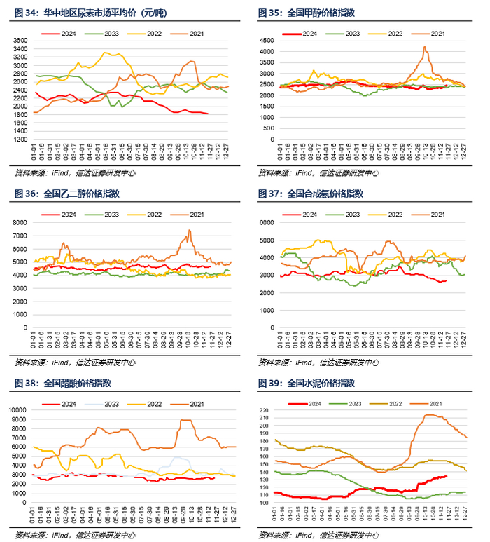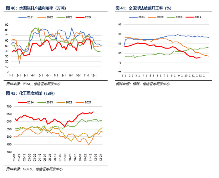 化工耗煤周环比增加,钢铁高炉开工率周环比下降。化工周度耗煤:截至11月22日,化工周度耗煤较上周上升8.45万吨/日,周环比增加1.29%。高炉开工率:截至11月22日,全国高炉开工率81.9%,周环比下降0.15百分点。水泥开工率:截至11月22日,水泥熟料产能利用率为43.7%,周环比下跌17.5百分点。