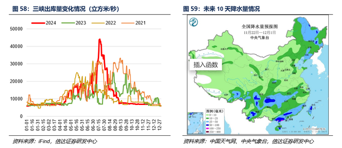 ⚫ 截止11月23日,三峡出库流量为6980立方米/秒,周环比增加0.14%。