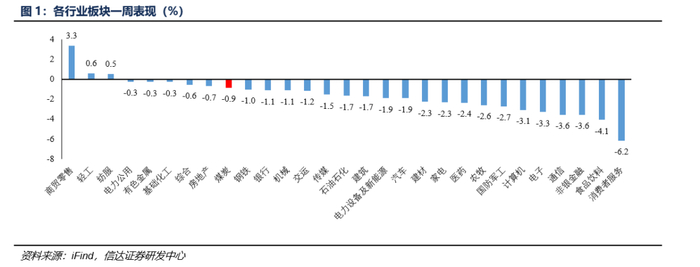 ⚫ 本周煤炭板块下跌0.85%,表现优于大盘;本周沪深300下跌2.60%到3865.70;涨幅前三的行业分别是商贸零售(3.33%)、轻工(0.57%)、纺服(0.51%)。