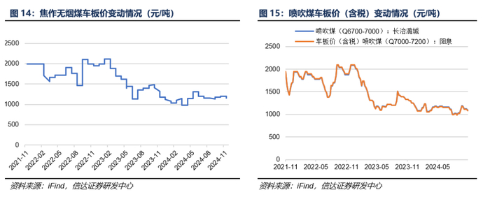 ⚫ 截至11月15日,长治潞城喷吹煤(Q6700-7000)车板价(含税)价格1092.0元/吨,周环比下跌30.0元/吨;阳泉喷吹煤车板价(含税)(Q7000-7200)1084.4元/吨,周环比下跌30.7元/吨。