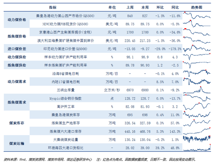 资料来源:Ifind,煤炭资源网,煤炭市场网,信达证券研发中心 注:红色点为高点。因数据披露频度、日期不一致,因此按周变动展示。