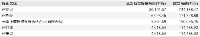 此次解禁的股东共有五位,分别为实控人“何氏家族”——何祖训、何乔关、何月斌和何宝见四人及一致行动人云南正道投资发展合伙企业(有限合伙)。原始股东持股成本通常远低于发行价,不过实控人家族暂未披露减持计划,且公司正处于股份回购期,此次解禁筹码集中,解禁压力不大。