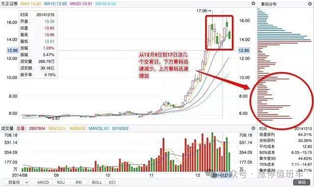 如图所示,方正证券从第一次直接拉升至高点17.15元到回调然后再次到拉升的过程中,最原始建仓区域的6元成本处筹码不断向上移动。可以看到:虽然筹码整体都在上移,但是下方6元处的筹码仍未完全派发完,这表明主力需要再进行最后的收尾工作,使其完全脱身。