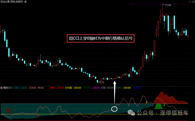 当周线CCI上穿0轴时,这是中期行情确认的信号。在这个信号出现时,我们还要观察周线KDJ指标是否出现回头或死叉,但前提是周线MACD没有明显变坏,否则这个信号将失效。