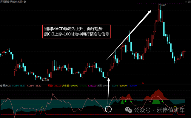 当周线MACD确认为上升、向好趋势时,并且周线CCI上穿-100时,这是中期行情启动的信号。同时,我们还需要注意周线KDJ指标在20附近金叉的出现以及周线MACD金叉的确认。