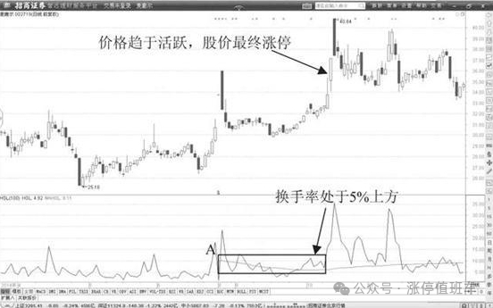 要点1:当换手率指标达到5%以上的时候,价格走势趋于活跃。图中A位置换手率明显向上突破,接下来的一个月中,换手率稳定在5%上方,价格持续飙升直至涨停。