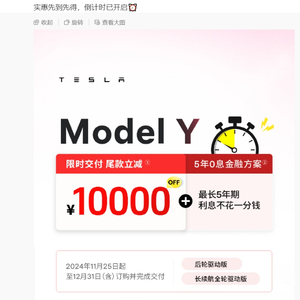 据特斯拉微博11月25日消息,Model Y限时交付尾款立减10000元,可叠加五年0息政策。