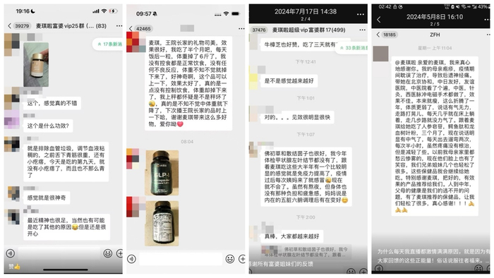 而经常抽奖送礼物、把粉丝引入更为隐蔽的微信群互相“种草”,分享心得,是“麦琪啦”提高粉丝黏度,进一步“养粉”变现的方式之一。她在朋友圈里,发布不少减肥、保健类产品的粉丝反馈截图。截至目前,“麦琪啦”至少建立了25个微信粉丝群。11月上旬,澎湃新闻凭购买记录加群后观察发现,“麦琪啦”会不时转发其他群友反馈的产品效果截图,也有群友“晒”出自己收到的产品或礼物。