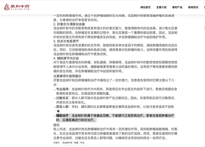 “龙血树叶粉“对肿瘤有潜在辅助作用的文章,截自“康和中药”官网