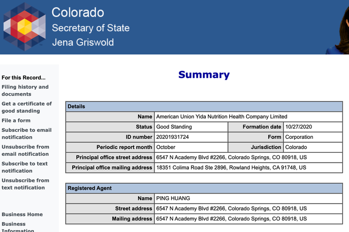 记者在多个搜索引擎平台、全球购物网站上没有找到上述产品,关于Unionyidahealth的信息鲜少。其官网的产品页面上,展示了该公司旗下其他品牌的几款天然营养补充剂产品,但没有上述产品。官网上也没有任何有关该公司、生产工厂的资料介绍和实景照片。记者注意到,该公司注册地为科罗拉多州。负责监管州内注册公司的科罗拉多州州务卿办公室网站显示,该公司成立于2020年10月,公司注册人名为“HUANG PING”。