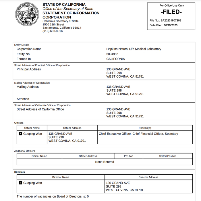 霍普金斯自然生命医学实验室2023年10月的公司信息存档记录,截自加利福尼亚州州务卿办公室网站