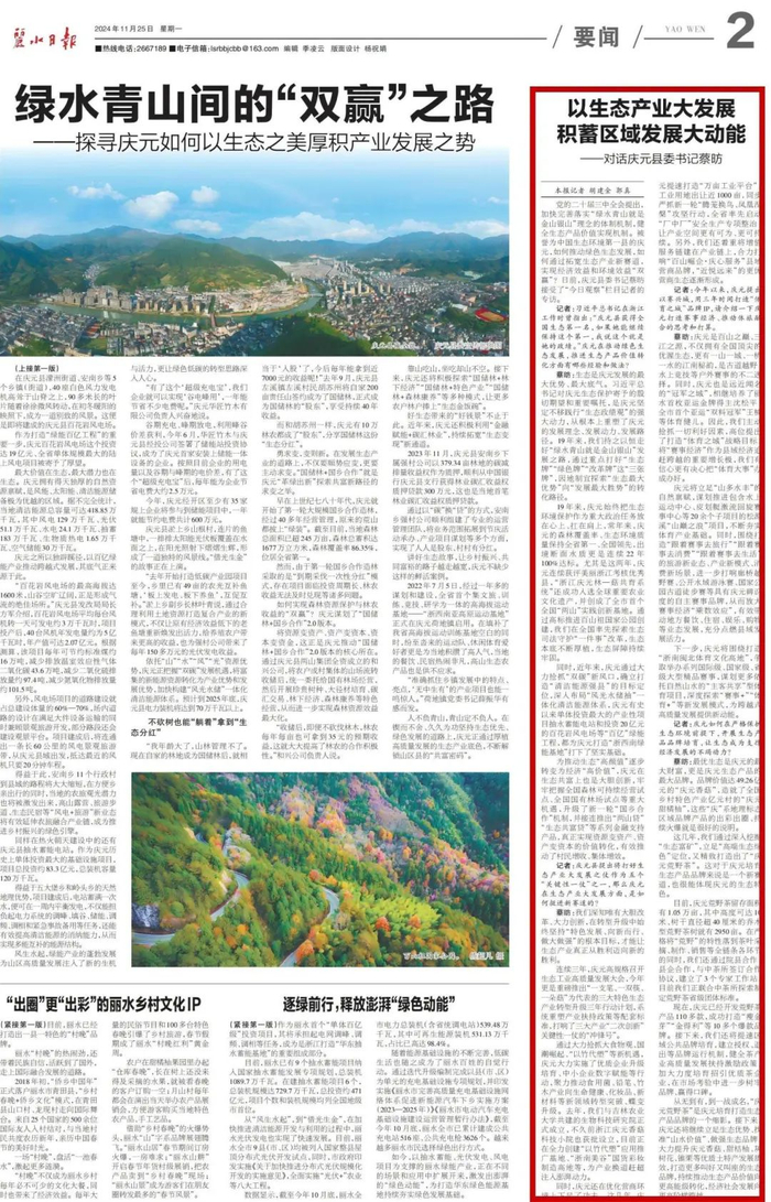19年来,庆元始终把生态环境保护作为重大政治任务放在心上、扛在肩上,常年来,庆元的森林覆盖率、生态环境质量保持全省第一、全国领先,出境断面水质更是连续22年100%达标。尤其是这两年,庆元连续获评美丽浙江考核优秀县,“浙江庆元林—菇共育系统”还成功入选全球重要农业文化遗产,并创成了全市首个全国“两山”实践创新基地。通过高标推进百山祖国家公园创建,我们在全国率先探索生态司法守护“一件事”改革,生态本底不断厚植,生态屏障持续牢固。