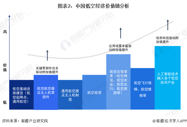 整体来看,低空经济产业从低空基础设施建设开始,产业链延伸至低空航空器制造(飞行器制造)、低空运营服务、低空飞行保障等,在整条低空经济产业价值链中,关键零部件攻关驱动低空航空器及无人机零部件附加值提升,应用场景逐步开拓及丰富驱动低空运营服务的附加值提升,人工智能等信息科技的发展驱动低空经济产业附加值提升。