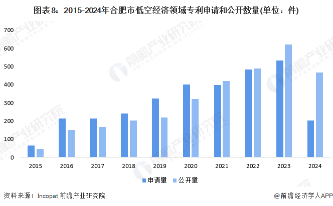 合肥市积极推动低空经济领域研发和创新,专利申请和公开数量保持较高水平。2016年以来,合肥市低空经济相关专利申请量保持在200件以上,2023年达到534件,创历年新高。专利公开方面,2015年以来呈现增长趋势,2023年达到621件,较2022年增加132件。