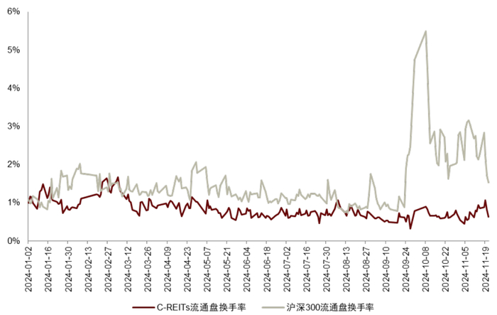 流动性仍是市场重要关注。根据《中金REITs年度市场调查报告(2025)》[3]显示,市场流动性仍是机构配置决策关注的焦点之一。年初至今(截至2024年11月21日),公募REITs市场平均日换手率仅为0.83%(同时期沪深300换手率为1.48%),若剔除做市商交易贡献,成交活跃度或进一步下降。我们认为流动性相对不足对于机构而言,诚然影响其配置体量和节奏,但或不影响配置方向。若以发展的视角来看,伴随市场扩容以及投资者结构进一步多元化,我们认为市场流动性问题或将得到逐步解决。