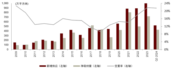 图表19:全国物流仓储新增供应、净吸纳量和空置率