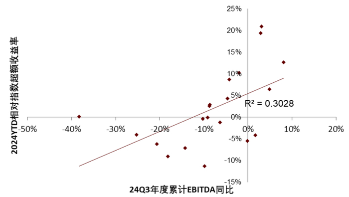 图表9:REITs项目年初至今超额收益率与前三季度累计EBITDA同比呈趋势相关