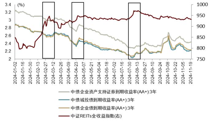 ► 配置压力仍是固收资金参与REITs投资的主要推动力,关注“资产荒”演绎及理财负债端波动。我们可以观察到今年中证REITs全收益指数的三个阶段性顶点均出现在债市收益率的阶段性反弹附近,而REITs的连续上涨基本伴随(或前期已经积累)债市收益率的下行,近期债市收益率中枢有所上移后REITs指数也进入盘整,资金REITs配置需求更多转向一级市场。另一方面,由于理财资金参与REITs投资的策略有所优化,使REITs市场受到2023年9月、2024年9月理财赎回潮的扰动程度相比2022年11月整体上看有所减小,但后续仍需关注风险偏好变化下理财负债端的波动程度及其对债市整体收益率中枢、“资产荒”程度的影响。