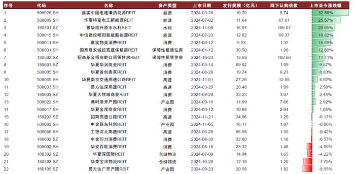 一级市场供给加速,部分新资产类型享稀缺溢价。受市场情绪回暖以及审批加速等因素推动,2024年公募REITs市场首发项目入市节奏提速,截至2024年11月21日,2024年上市新项目达22只,累计发行规模超500亿元,其中产业园3单、物流仓储2单、保障房2单、消费7单、高速4单、能源3单和水利1单。结合网下认购及后市涨幅情况,我们认为在一级市场加速供给情形下,二级市场估值及项目稀缺性和经营稳定性或较大程度影响市场投资判断。