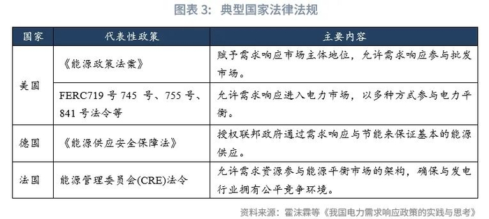 美国、欧美等国家电力市场起步较早,其在需求响应方面政策与实践对我国完善需求响应政策体系具有较好参考价值。总体来看,电力市场典型国家在法律法规、市场机制、电价政策等方面均结合本国电力行业发展情况设计相应策略。