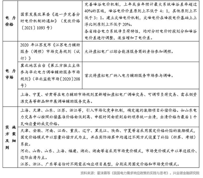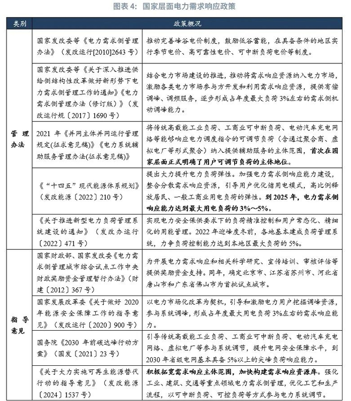 国家明确鼓励开展需求响应。目前我国需求响应政策主要包括管理办法类、指导意见类、实施方案类、电力价格类、电力市场类等不同种类政策。其中,管理办法类主要明确需求响应内涵、实施主体、市场化方向等内容;指导意见类确定响应能力建设总体目标;电力价格类为电力用户参与需求响应的价格策略提供指导;电力市场类主要为确定不同细分电力市场对需求响应主体的准入规则等;实施方案与细则为需求响应申请条件、实施流程、补偿标准、补偿资金等各方面内容。