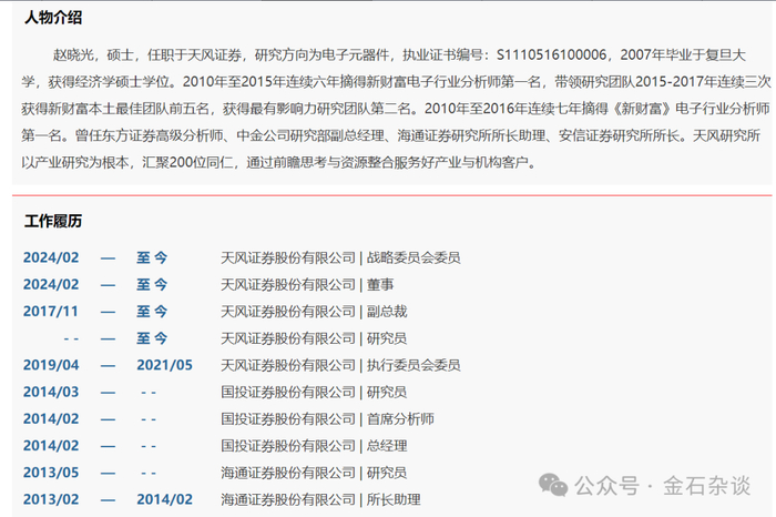 至于,本此观点主角的赵晓光,无疑是卖方大佬级人物,有着15年卖方经验,在中金当过副总,在安信当过总经理,在天风是董事、副总、执委,他是新财富分析师常客,常年拿到新财富电子第一名。