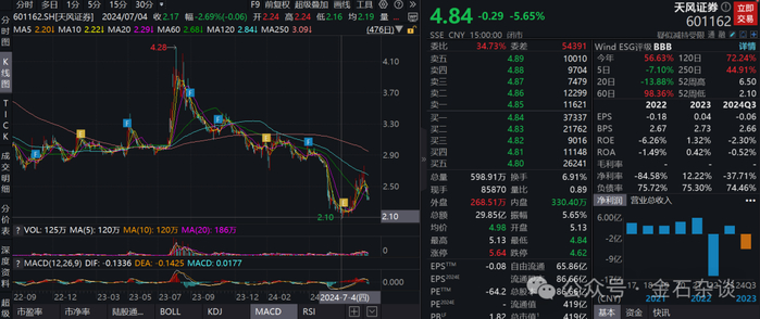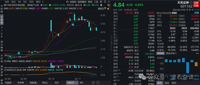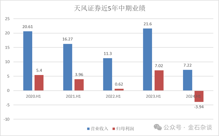 金石杂谈查询发现,近5年上半年业绩来看,天风证券业绩波动较大,2022年营收较2020年腰斩,净利润更是低至0.62亿元;但2023年中期突然收入翻倍至21.6亿,利润暴增好几倍至7亿;时隔1年,天风业绩再度变脸,半年亏损3.94亿。第三季度更狠,营收近乎腰斩至13.41亿,净亏损扩大226%至5.36亿。