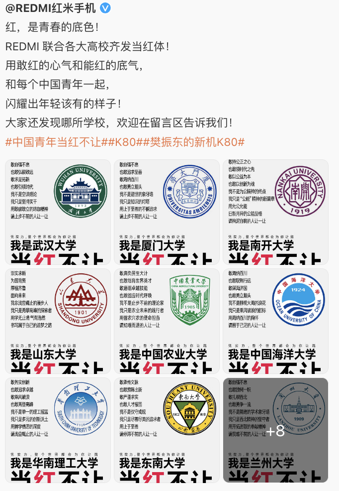 有人晒出各种角色的当红不让,有雷军、王腾、理发师晓华……就连各大高校也都纷纷加入进来,和红米联合发布“当红不让体”。
