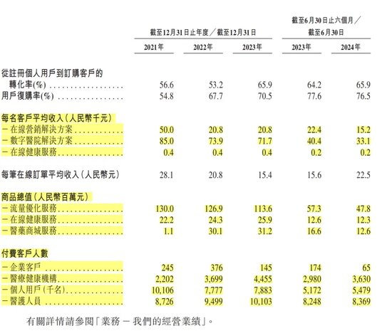 报告期内,三大业务板块中,来自每名客户的平均收入均呈现下滑趋势。其中,在线营销解决方案业务的每名客户平均收入由2021年的5万元下降至2024年上半年的1.5万元,数字医院解决方案的每名客户平均收入由2021年的8.5万元下降至2024年上半年的3.3万元,而在线健康服务由2021年的0.04万元进一步下降至0.02万元。