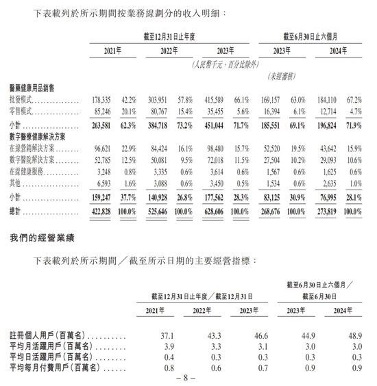 就公司目前的主营业务来看,健康160共有两大业务板块,分别为医药健康用品销售、数字医疗健康解决方案,其中医药健康用品销售为公司主要收入来源。2021年—2023年以及2024年上半年(下称“报告期”),医药健康用品销售所产生的收入分别占公司总收入的62.3%、73.2%、71.7%、71.9%。