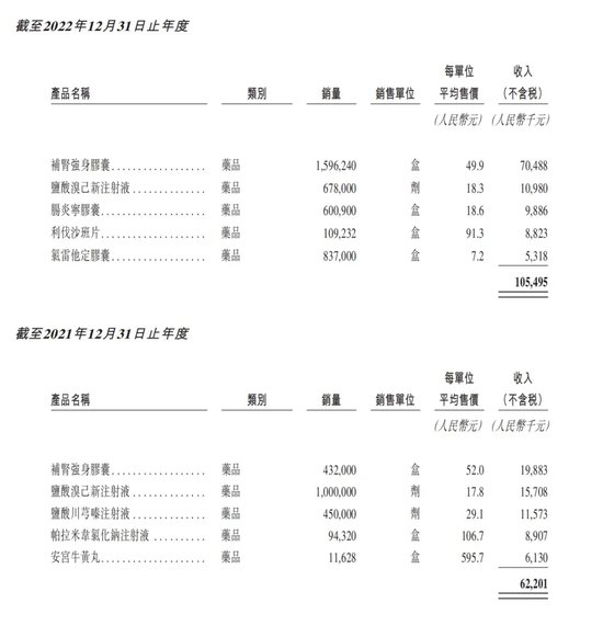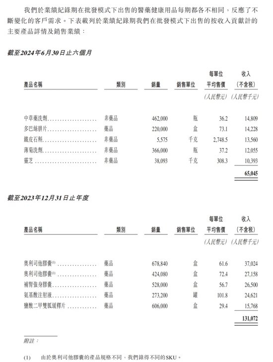 而根据招股书中的内容,公司表示,在批发模式下出售的医药健康用品每期都各不相同,反映了不断变化的客户需求,不过,按照收入贡献来计,每年贡献较大的主要产品名录似乎也颇为有趣。