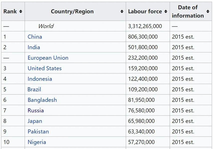 上图是世界劳动力资源排行,中国稳稳居于世界之首。