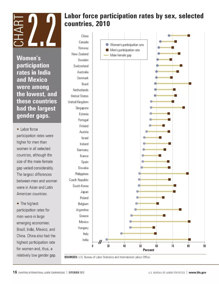 上图所反映的便是世界各国男女劳动参与率对比,深色方块代表男性,灰色圆形代表女性。