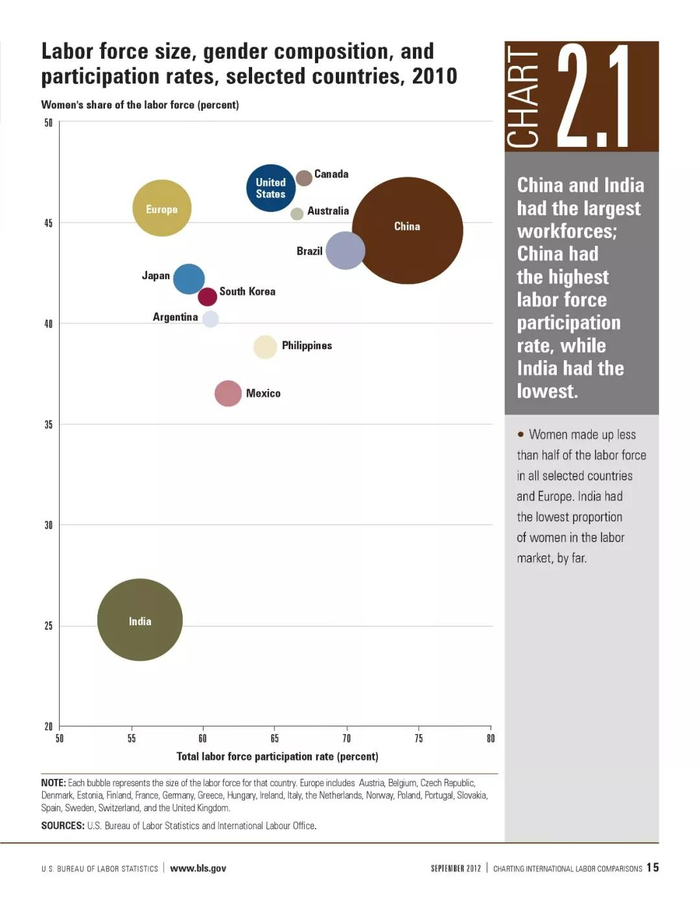 上图显示了部分参与调查的各国劳动参与率,圆形的面积代表着国家劳动总量,图表的x轴(横轴)代表着劳动参与率,y轴(竖轴)则代表女性参与劳动比率。