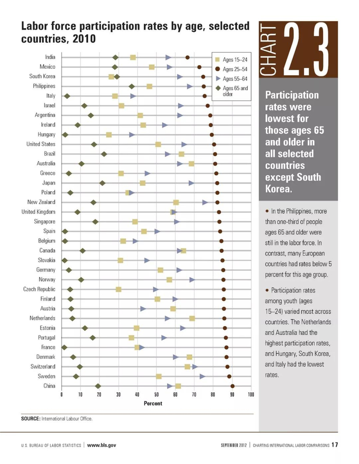 从图中可以看到,世界各国各年龄层的劳动参与率,中国达到惊人的90%,位列世界第一!