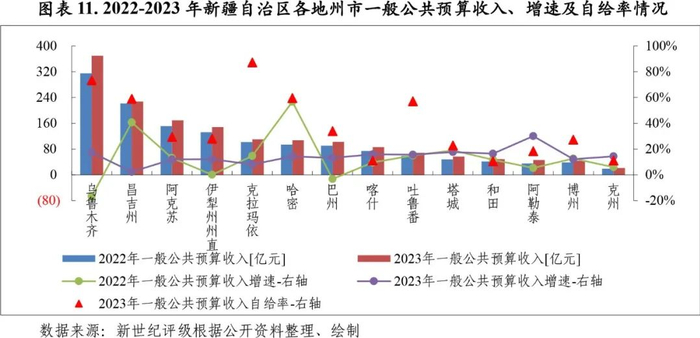 从一般公共预算收入构成看,新疆大部分地州市非税收入占一般公共预算收入的比重偏高,一般公共预算收入稳定性一般。2023年,哈密市税收比率以85.73%仍居于首位,乌鲁木齐和巴州税收比率分别以77.84%和72.67%次之;阿克苏地区、昌吉州、克拉玛依市税收比率较上年均有所下滑,跌破70%但仍处于60%以上。其余地区除博州外税收比率均在50%-60%区间,博州税收比率较上年下降3.61个百分点至47.98%。其中2023年克拉玛依市和阿勒泰地区税收比率较上年下跌均超过10个百分点,主要系当年国际原油价格大幅下行导致克拉玛依市税收收入同比下降,以及两地非税收入中国有资源(资产)有偿使用收入大幅增长所致。从一般公共预算收入自给能力看,新疆各地州市一般公共预算收入对其支出的覆盖程度总体较弱,其中克拉玛依市和乌鲁木齐市当年一般公共预算自给率分别上升至87.21%和73.36%居于前二,哈密市、昌吉州和吐鲁番市该比率分别以59.61%、58.98%和57.00%次之,其余各地州市该比率均低于35%,地处南疆边境地区的喀什地区、克州、和田地区一般公共预算自给率仅处于10%上下,收支平衡对上级转移支付的依赖度很高。