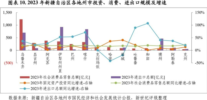 从经济发展的动力结构看,随着西部大开发的大力推进,投资在新疆经济增长方面持续处于主导地位,在基建补短板及能源产业投资拉动下,2023年各州市固定资产投资均同比增长,大部分地区增速在两位数以上,其中工业基础相对较好的资源型州市在第二产业投资增长拉动下,固定资产投资增速总体相对较快;当年塔城地区、哈密市、昌吉州和吐鲁番市增速均超过20%,主要系第二产业投资大幅增长拉动;和田地区、阿克苏地区、博州和阿勒泰地区固定资产投资增速在上年高增速后回落至低位,其中和田地区、阿克苏地区2023年增速分别为1.1%和2.4%,主要系基础设施投资增速放缓所致。此外,上年投资增速较低的乌鲁木齐市,当年在绿电光伏等风光项目和新能源产业投资拉动下,基础设施投资同比增长34.5%,工业投资同比增长32.6%,固定资产投资增速较上年提升12.3个百分点至12.60%;巴州在化工、新材料、新能源产业链投资带动下,非石油工业投资同比增长1倍,固定资产投资增速较上年提升19.7个百分点至17.60%。