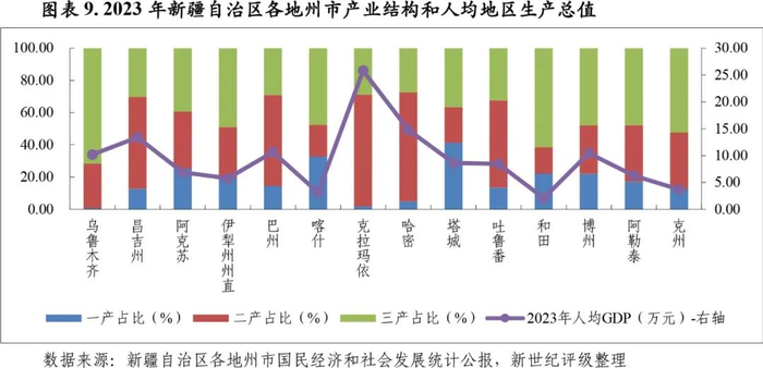 从三次产业结构看,新疆各地州市产业结构区域差异较大,克拉玛依市、哈密市、昌吉州、巴州和吐鲁番市依赖油田、煤炭等资源,第二产业占比分别以69.52%、67.50%、57.09%、56.56%和54.04%的水平大幅领先,排名前五,其中克拉玛依市石油资源优势明显,克拉玛依油田所处的准噶尔盆地石油天然气、油砂矿、煤层气、油页岩、盐、煤炭等自然资源极为丰富;哈密市煤炭、矿产及风光资源富集;昌吉州煤炭资源充裕,拥有全国最大的整装煤田—准东煤田;巴州矿产资源丰富,同时拥有全国三大气田之一的塔里木天然气田;吐鲁番市位于东天山成矿带,矿产种类较齐全,煤、石油、天然气资源储量位居全自治区前列。乌鲁木齐市、和田地区、克州和伊犁州州直以第三产业为主,占比分别为71.70%、61.50%、52.37%和49.08%;塔城地区产业结构层次相对偏低,第一产业占比达41.29%,而工业经济基础较为薄弱,第二产业占比与和田地区、喀什地区以20%左右垫底;喀什地区和阿克苏地区农业经济占比同样相对较高,分别为32.69%和25.25%。2023年,随着旅游业及交通运输等服务业的逐步回暖,乌鲁木齐等部分州市三产占比有所回升。