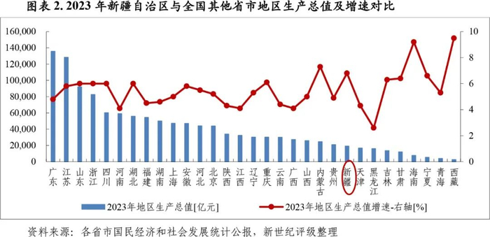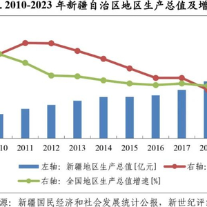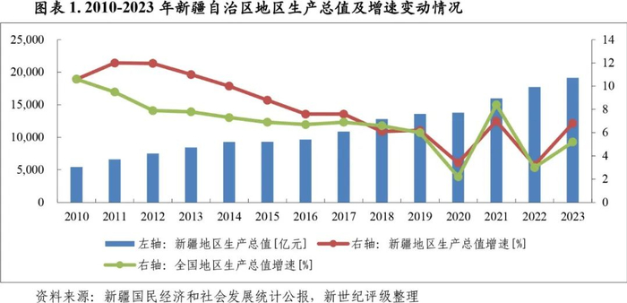 新疆地域辽阔,旅游、能源及矿产资源丰富,且土地、电力、劳动力等方面具有低成本优势,资源转化空间仍较大;同时,基于特殊的政治及战略地位,新疆可持续获得国家的大力支持。但由于地处不稳定因素较多的边疆地区,新疆始终面临“稳定”和“发展”双重挑战;为加快新疆发展、维护新疆稳定,2010年新一轮全国对口援疆工作开展,截至目前已召开九次工作会议,并陆续出台了差别化产业经济政策,建设喀什、霍尔果斯特殊经济开发区,建设丝绸之路经济带核心区等推动当地经济发展、促进就业的重大政策,为新疆经济发展提供了良好的政策支撑。近年来,在维护社会稳定和长治久安的治疆总目标下,新疆经济保持发展,但由于全区经济基础较为薄弱,经济总量在全国仍处于落后水平。2023年,新疆实现地区生产总值1.91万亿元,在全国31个省市中仍排名第23位;随着超预期因素影响的逐步消退,当年新疆经济复苏良好,经济增速较上年回升3.6个百分点至6.8%,高于全国增速1.6个百分点。同年,全疆人均地区生产总值为7.38万元,为同期全国水平的0.83倍。