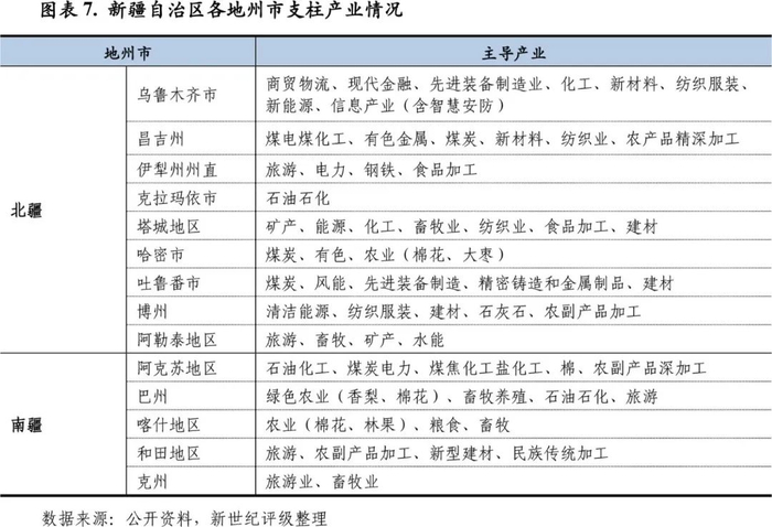 从区域经济发展水平看,新疆各地州市资源禀赋、自然环境、区位条件、发展战略导向等不同,区域经济发展水平呈明显分化格局,地区经济发展不均衡现象较为突出。首府乌鲁木齐市作为新疆的政治、经济、文化、科教和交通中心,其经济规模远领先于其他各地州市,并且产业以第三产业为主,三产占比达71.70%,表现出较显著的强省会效应,以其为中心的北疆地区经济发展水平整体也相对较强;而南疆地区大多为边境、荒漠地区,距离经济核心区较远,受制于交通及自然条件发展相对落后。资源方面,北疆的昌吉州、克拉玛依市,东疆的哈密市、吐鲁番市,南疆的巴州等地区能源及矿产等资源丰富,第二产业占比高;塔城地区、喀什地区等则第一产业占比相对较高。但近年来在稳定并发展南疆的中央政策基调下,国家出台了一系列支持南疆四地州(喀什地区、和田地区、阿克苏地区和克州)发展的优惠政策,包括自治区财力分配、重大基础设施建设配套资金安排和重大民生项目投入向南疆倾斜等,使得新疆南北差距逐步缩小,除克州和和田地区外,阿克苏地区、巴州和喀什地区经济总量均已处于全区中上游水平。