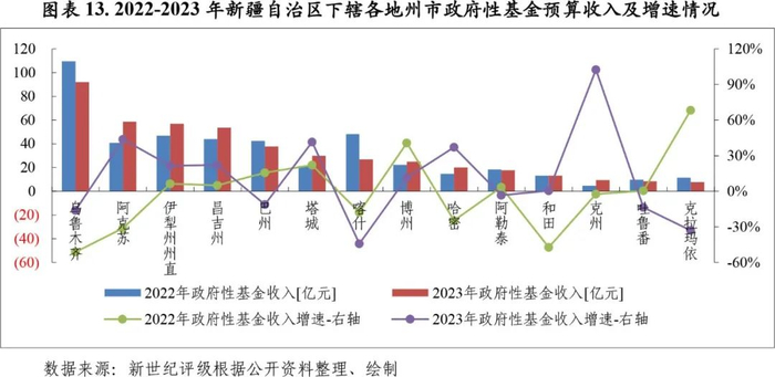 从相对规模看,以政府性基金预算收入与一般公共预算收入的比率作为参考指标,2023年博州、塔城地区和克州降序排名前三,分别为57.24%、52.66%和43.27%,阿克苏地区、伊犁州州直、巴州、喀什地区和阿勒泰地区处于35%左右水平,其中喀什地区2023年受政府性基金预算收入大幅下滑影响,该比率进一步下降,排名由上年的第一跌至第八;其余地州市该比率均低于30%。