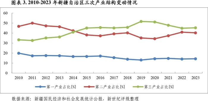 从三次产业结构看,十三五以来新疆加快推进产业转型,深入实施旅游兴疆战略,其经济增长模式已从依靠工业带动转变为第二、三产业双核驱动,但2020年以来,由于超预期因素对旅游业及交通运输业等冲击较大,新疆产业结构优化调整步伐总体放缓,三次产业结构占比从2020年的14.4:34.4:51.2调整为2023年的14.3:40.3:45.3,三产占比仍最高但有所下滑;其中2023年随着国内消费需求的恢复,新疆旅游业、交通运输业等行业快速回暖,三产占比较2022年有所回升。同年,全区实现第一产业增加值2742.24亿元,同比增长6.3%,其以粮、棉、果、畜为代表的特色农业发展较好,其中新疆作为全国优质商品棉基地,棉花总产量在全国占比超过90%;第二产业和第三产业增加值分别为7710.27亿元和8673.40亿元,同比分别增长7.2%和6.6%,增速较上年分别提升2.4个百分点和5.1个百分点。