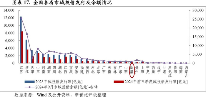 从城投债的发行情况看,新疆城投债发行活跃度相对较低,2023年及2024年前三季度,其发行规模仍处于全国中下游水平,分别为301.17亿元和348.71亿元,2023年发行量在全国各省市发行规模降序排列中较上年下降3位至第21位。从存续期内城投债情况看,截至2024年9月末全区城投存量债券余额合计947.46亿元,在全国31个省市降序排名中位于第23位,2024年1-9月净融资规模为42.77亿元;以一般公共预算收入对存续城投债券余额的覆盖程度来看,2024年9月末全区城投企业债券余额为其2023年一般公共预算收入的0.49倍。