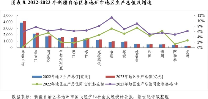 从经济增速来看,2023年在超预期因素对消费、旅游等影响逐步消退的背景下,各地州市经济增速较上年均呈现出不同幅度的上升态势,经济总体恢复较好。其中,哈密市、吐鲁番市、克拉玛依市和昌吉州经济领涨全区,增速分别为11.3%、9.0%、8.1%和7.7%,以采矿业、制造业等为主的重工业持续较快增长;博州、和田地区和阿勒泰地区增速相对偏低,分别以5.5%、5.0%和4.9%位列最后三位;其余州市增速均在6.0%-7.0%之间,其中乌鲁木齐市经济增速较上年提升5.7个百分点至6.0%,系当年增幅最大的州市。